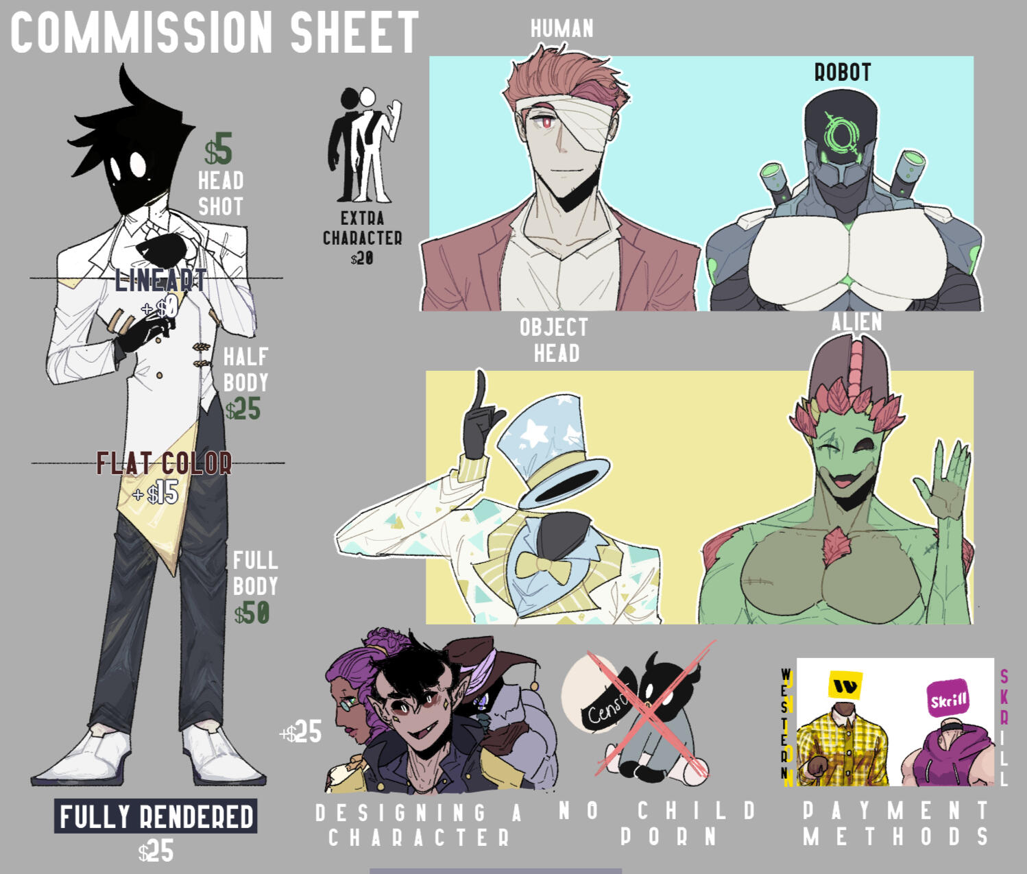 For anything that is nsfw, there is a fee of an extra $5. Can do both male and female but specializes in muscles and bara. Will not do minors, and scat play. Any other fetish should be inquired.